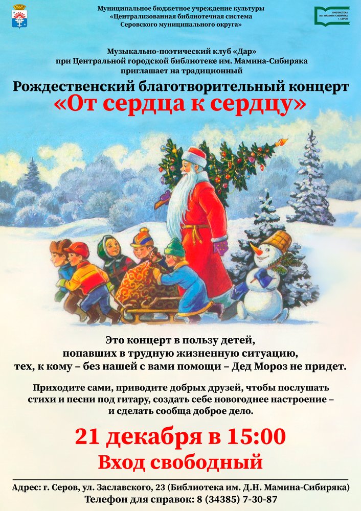 Музыкально-поэтический клуб «Дар» при Центральной городской библиотеке им. Мамина-Сибиряка приглашает на традиционный Рождественский благотворительный концерт «От сердца к сердцу»